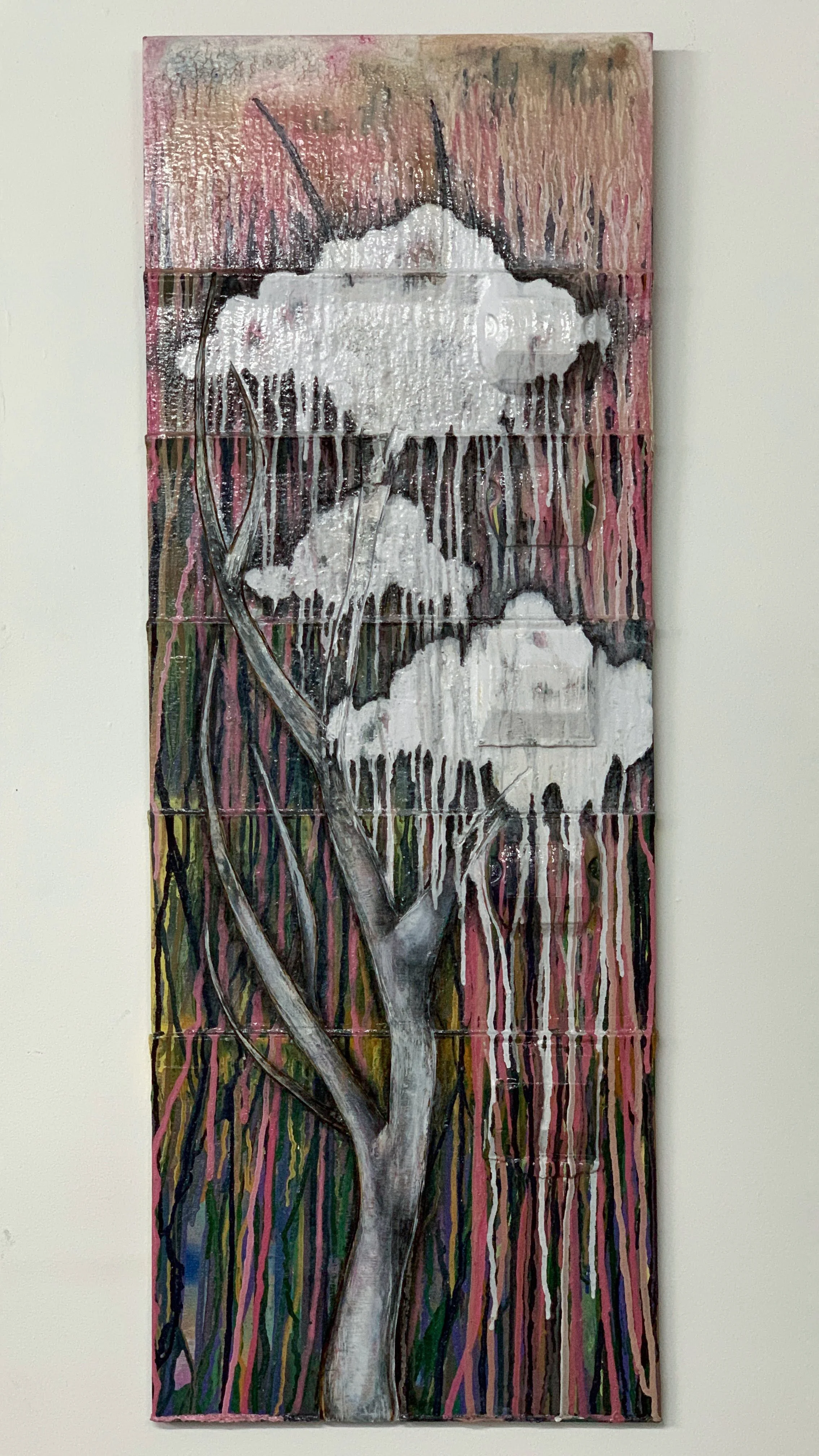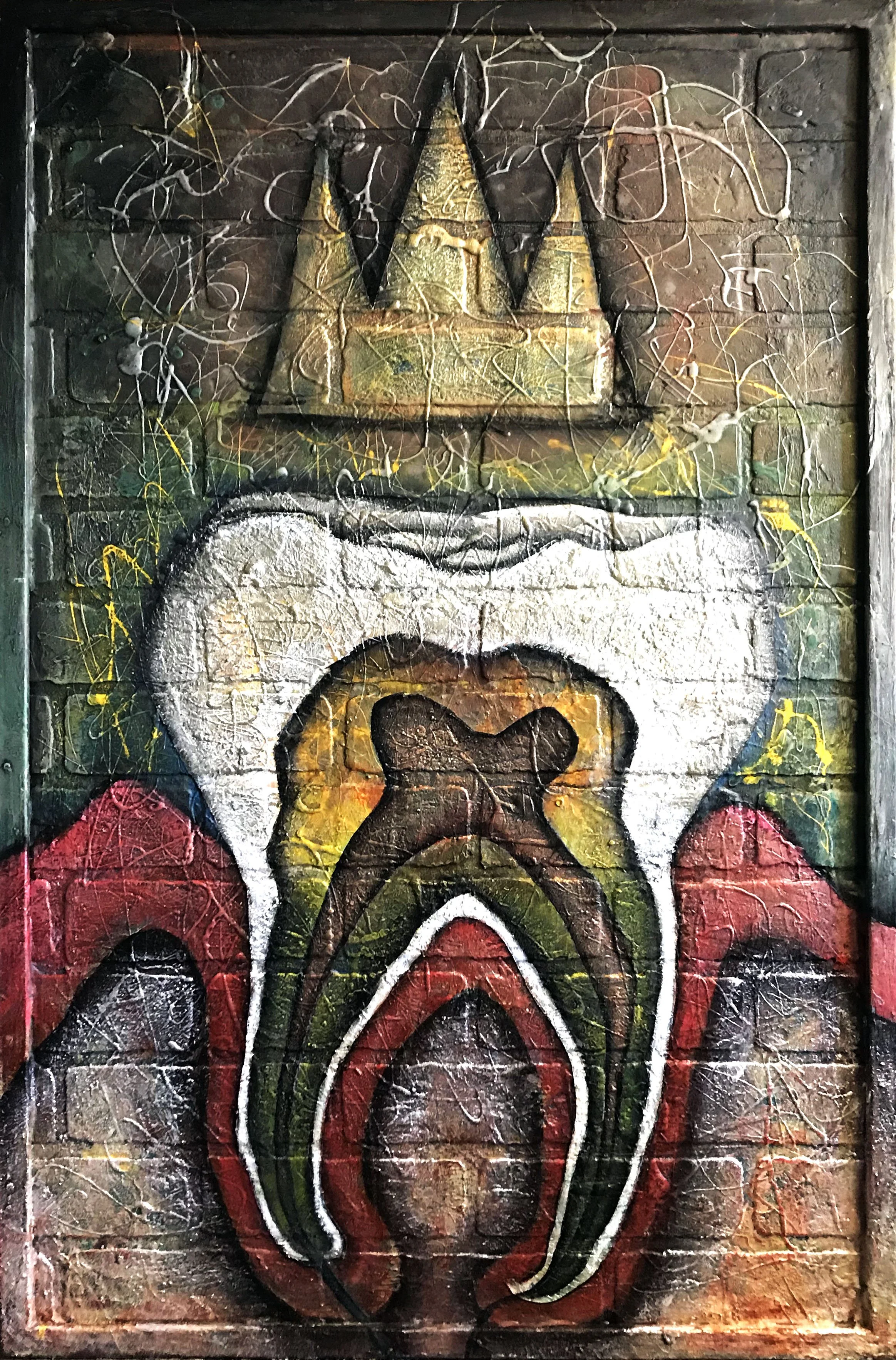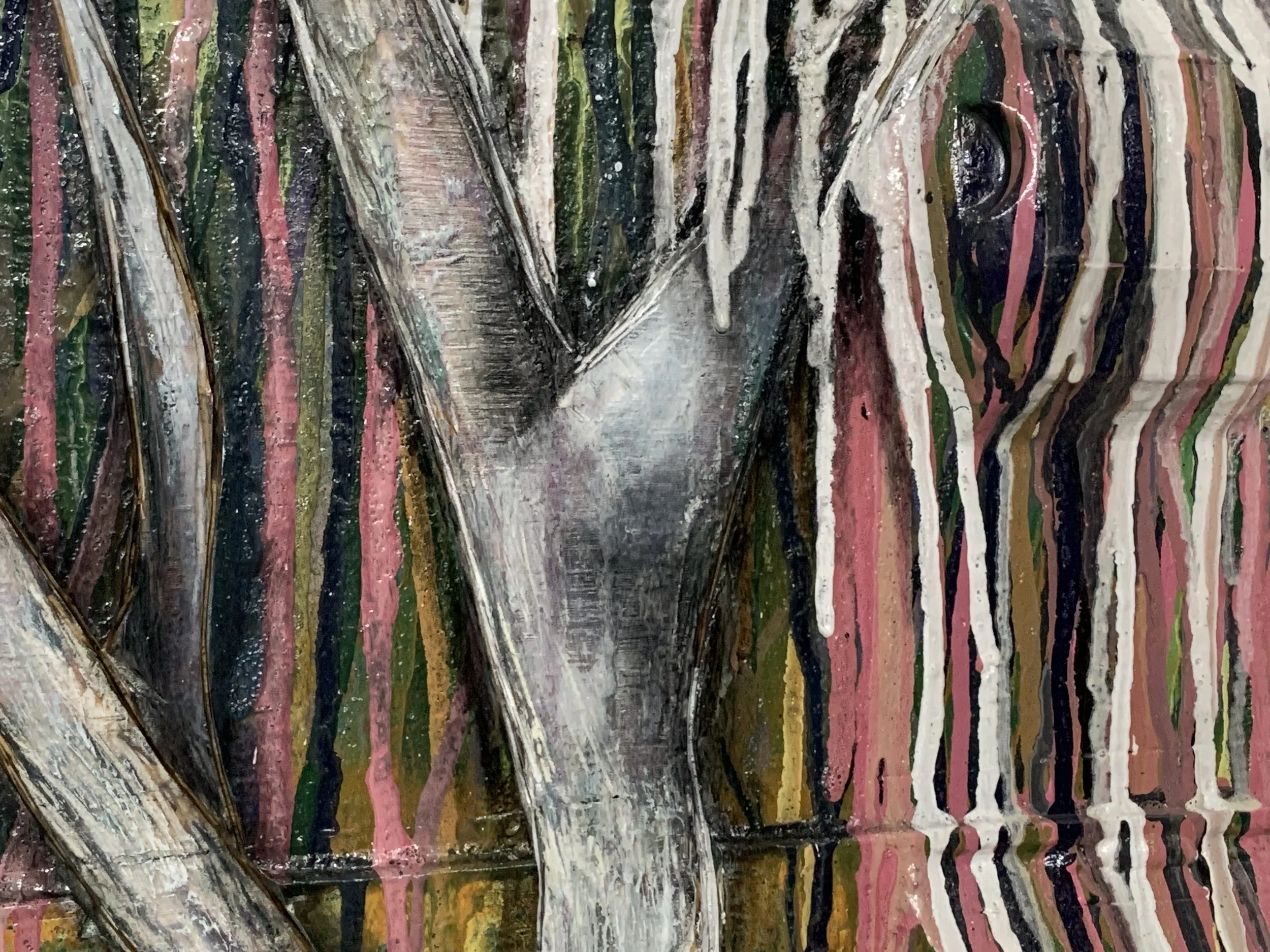 I wore this shirt to near death over 15 years and when its life was coming to an end, I could not bare to throw it away. So naturally I stretched it into a canvas. The depiction of the inner workings of a bee hive is meant to express how delicate and strong Mother Nature is at the same time. The offset hexagonal arrangement is one of the strongest structures found in nature. We all know that one swift kick can bring any well constructed hive to an end but then you’d have the bees to contend with.