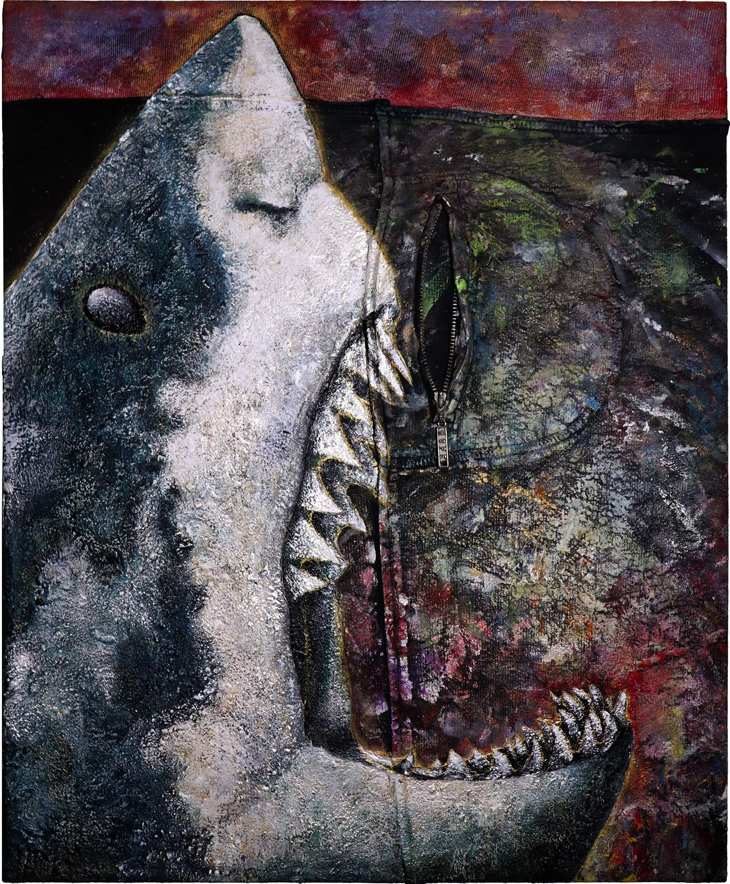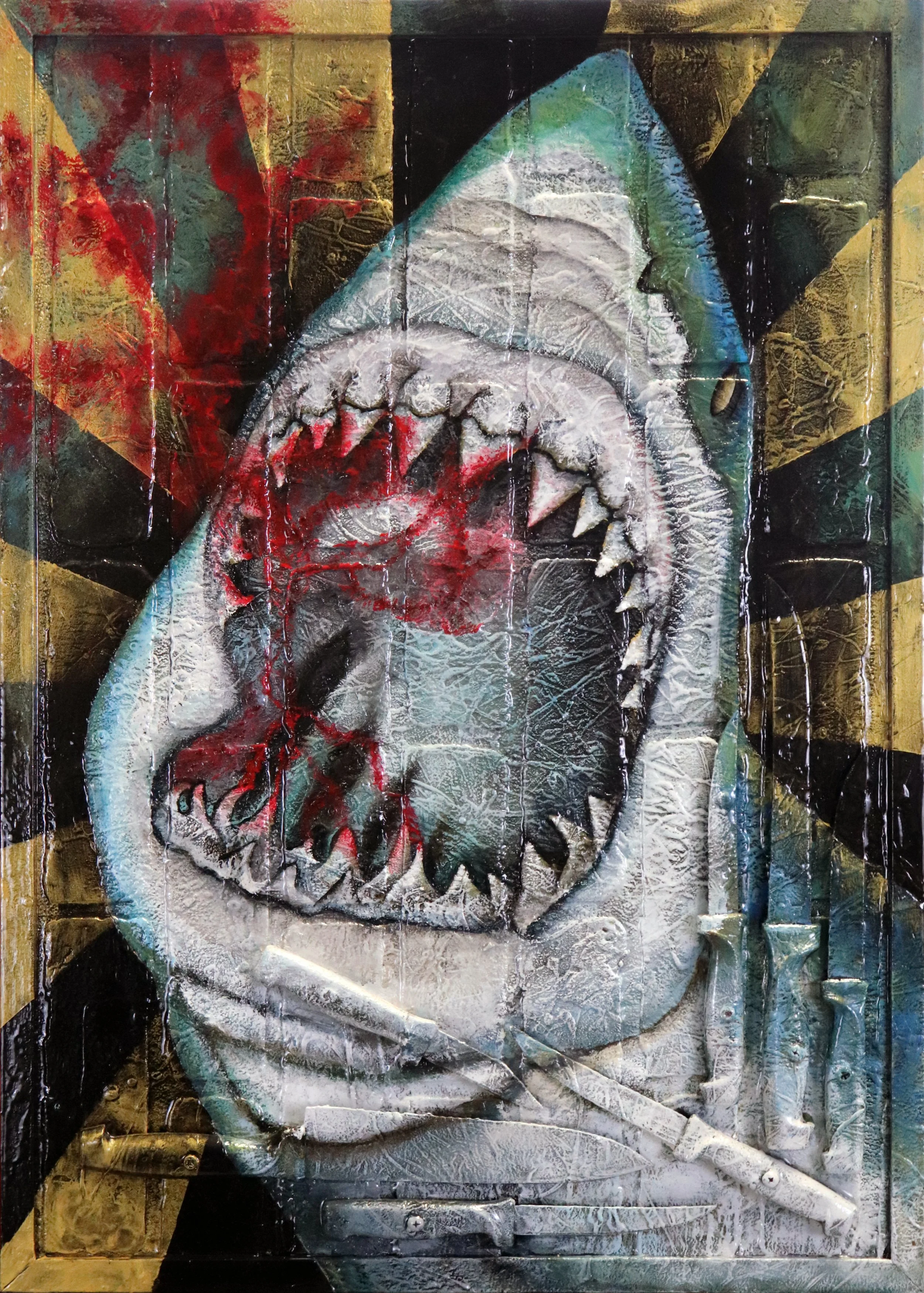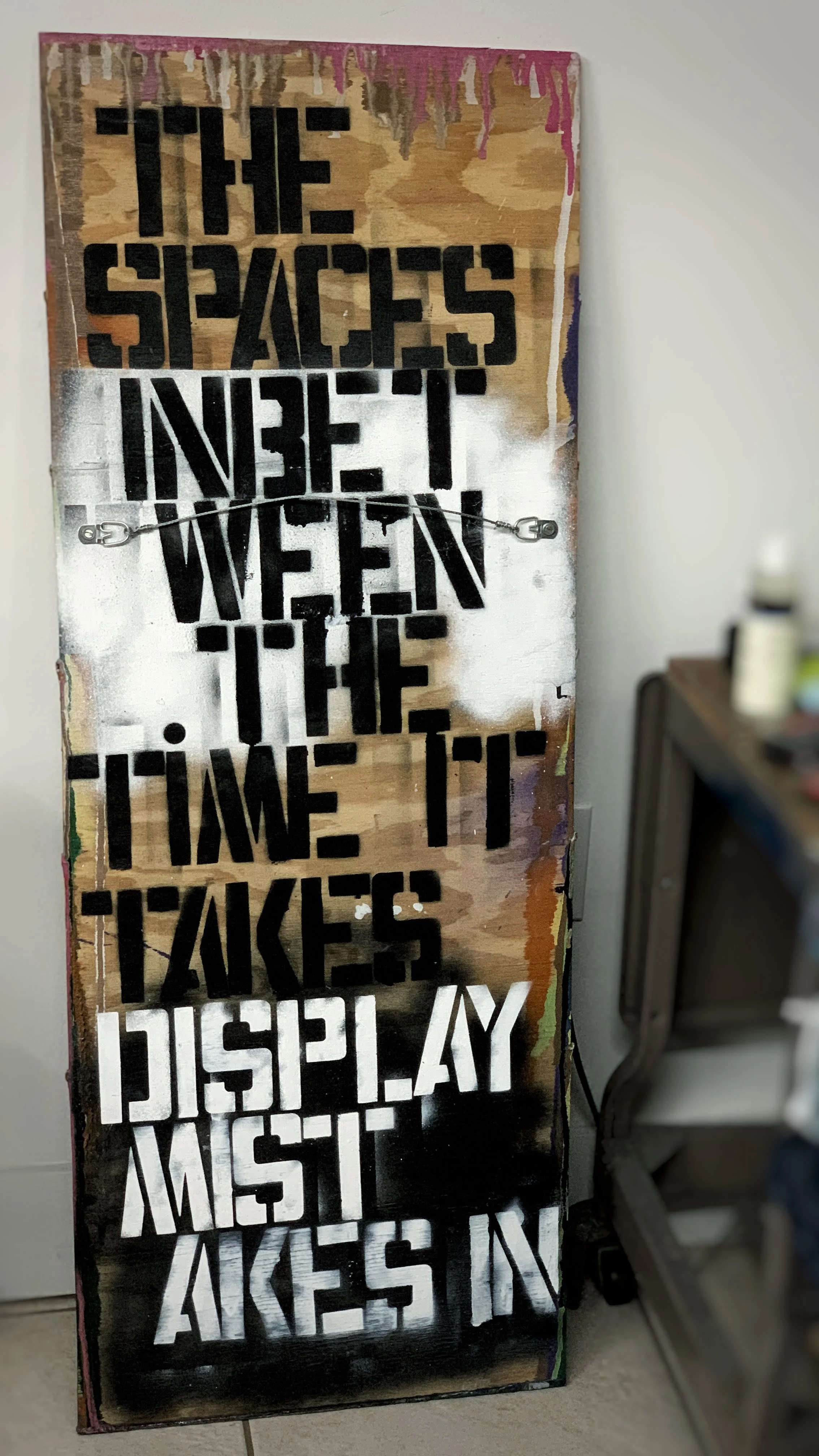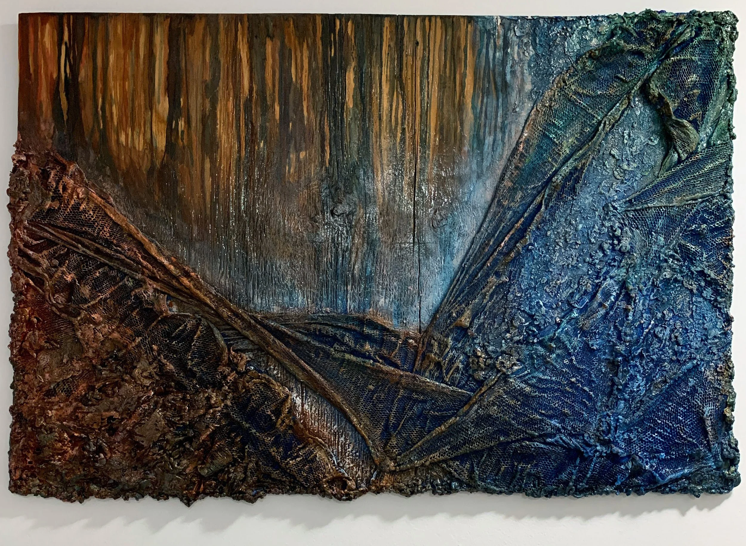 I wore this shirt to near death over 15 years and when its life was coming to an end, I could not bare to throw it away. So naturally I stretched it into a canvas. The depiction of the inner workings of a bee hive is meant to express how delicate and strong Mother Nature is at the same time. The offset hexagonal arrangement is one of the strongest structures found in nature. We all know that one swift kick can bring any well constructed hive to an end but then you’d have the bees to contend with.