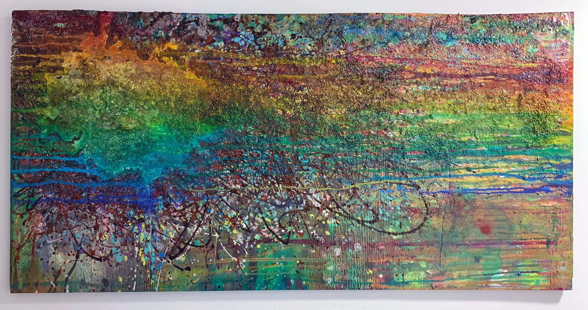 as we streak across a complicated sky March 20, 2024 by Nicole Storrs 48X24 joint compound, acrylic, house paint, minwax, triple thick glaze. 2020
