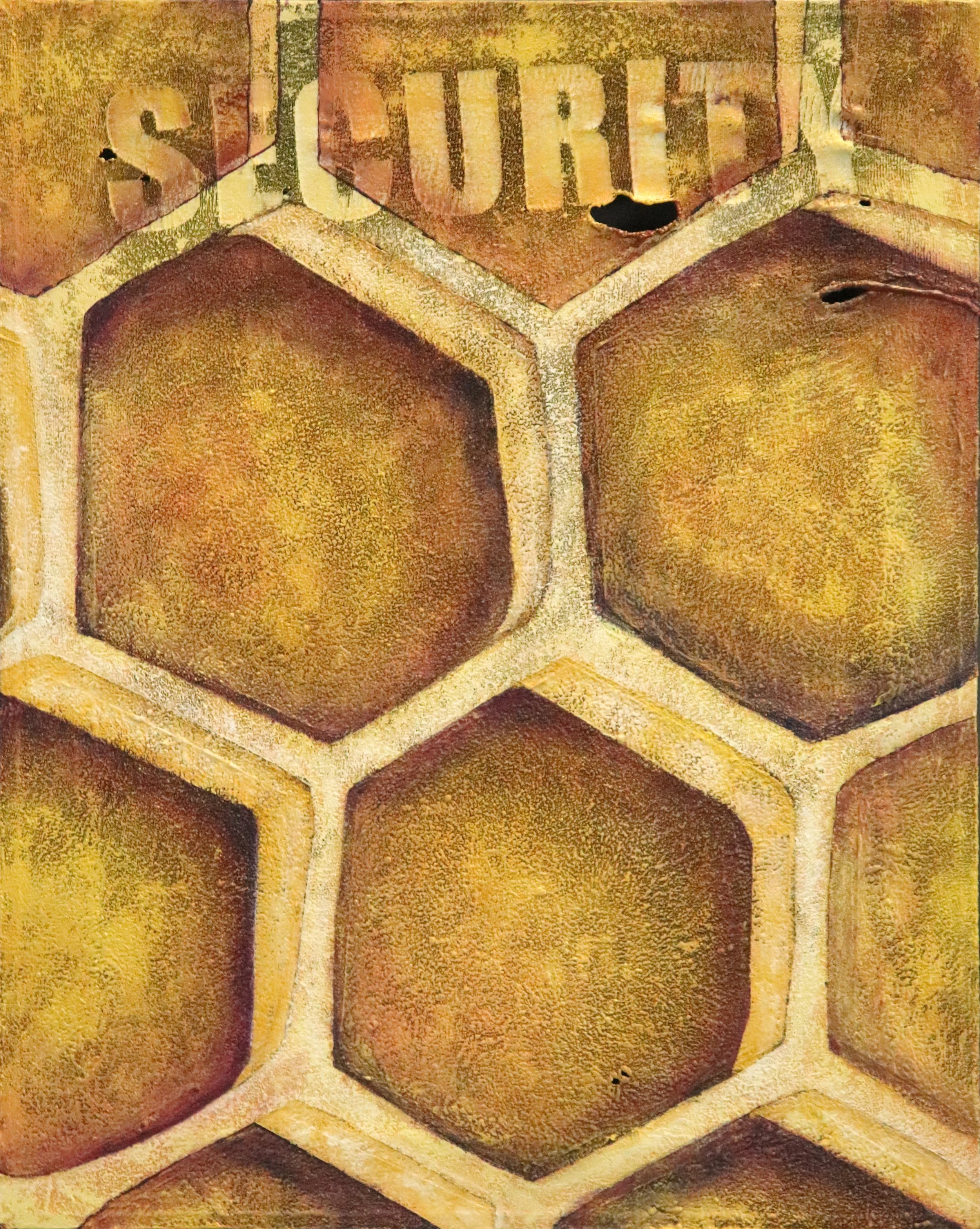 I wore this shirt to near death over 15 years and when its life was coming to an end, I could not bare to throw it away. So naturally I stretched it into a canvas. The depiction of the inner workings of a bee hive is meant to express how delicate and strong Mother Nature is at the same time. The offset hexagonal arrangement is one of the strongest structures found in nature. We all know that one swift kick can bring any well constructed hive to an end but then you’d have the bees to contend with.